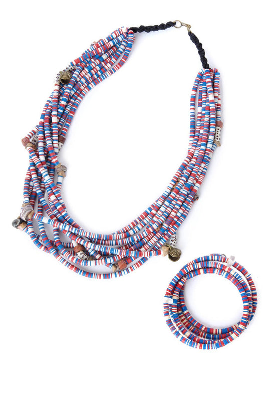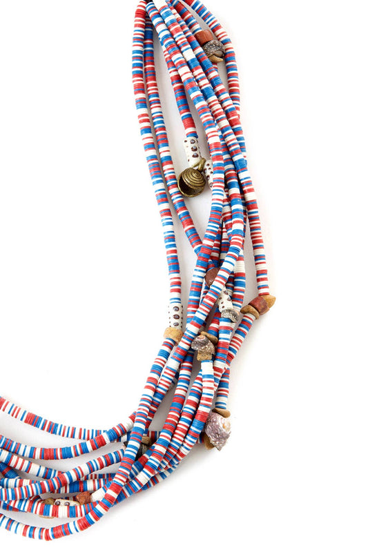 Red, White and Blue Heishi Bead and Brass Necklace