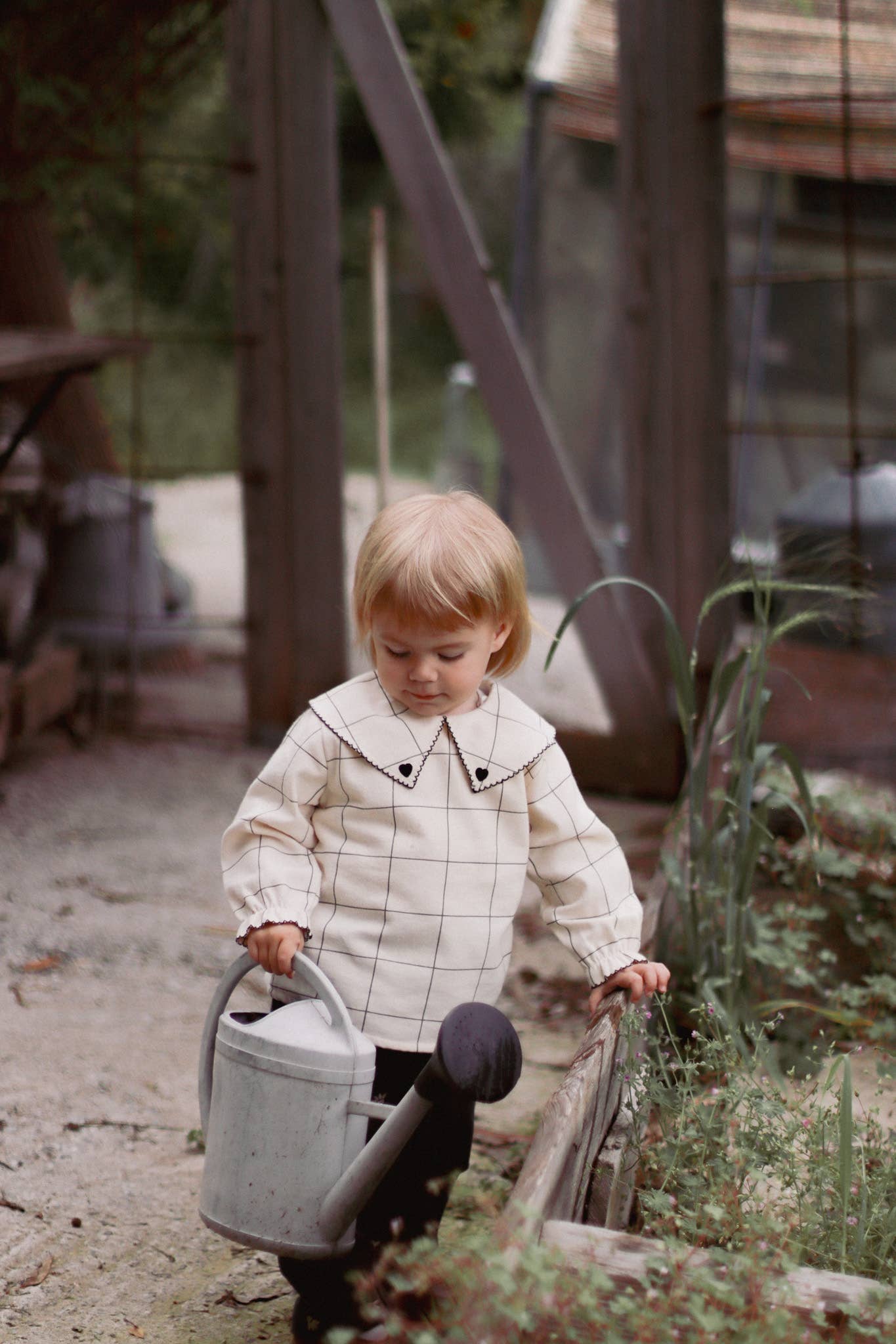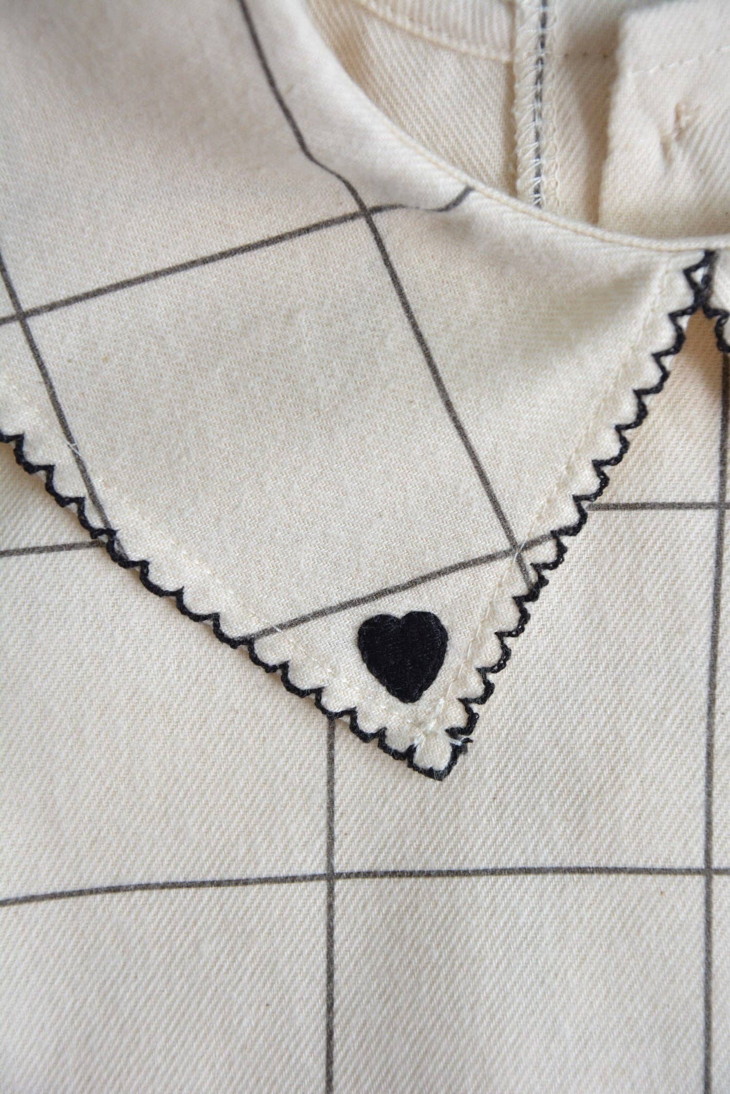 "Dalila Blouse" * Blouse made of 100% cotton fabric * Black trim detailed collar with "heart" embroidery * Black trim on elastic cuffed sleeves * Coconut Buttons on the back * Faded black check pattern on beige fabric * Color: Faded black line pattern on beige Composition: 100% Cotton, OEKO-TEX certified fabric. Care instructions: Wash at or below 30°C/86°F. Do not use bleach/whitener. Iron maximum 110°C/230°F. Do not tumble dry.