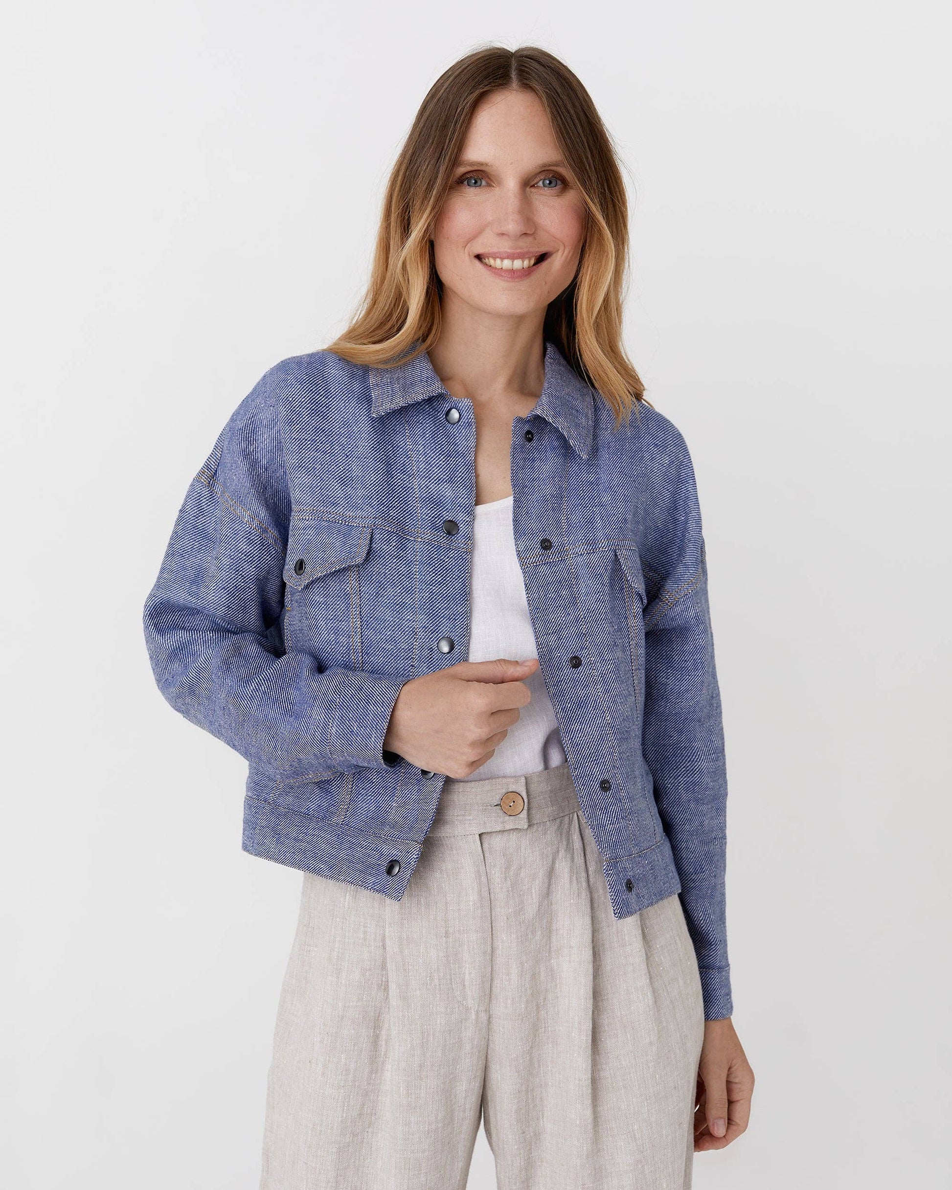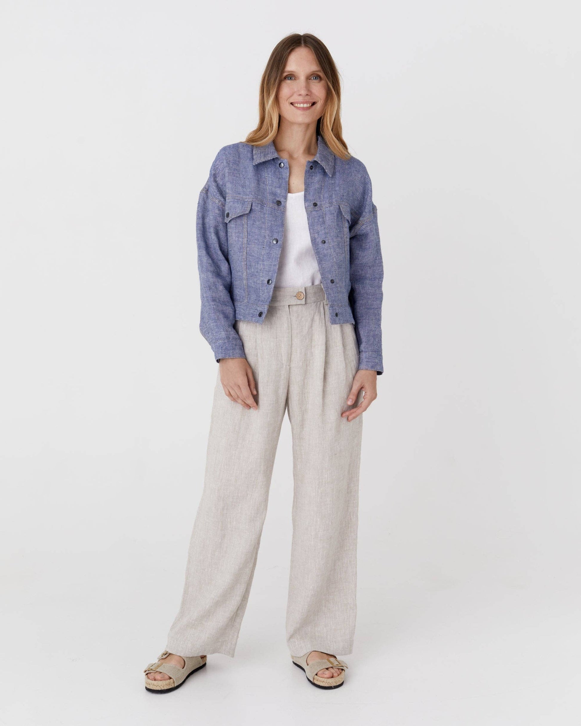 Capture a classic look with the LEURA heavyweight linen jacket in denim. This breezy piece features side ties that create a cut-out effect, complementing its sleeveless design and round neckline for a comfortable fit. Perfect for warm weather, this top offers a flattering and versatile addition to any wardrobe.