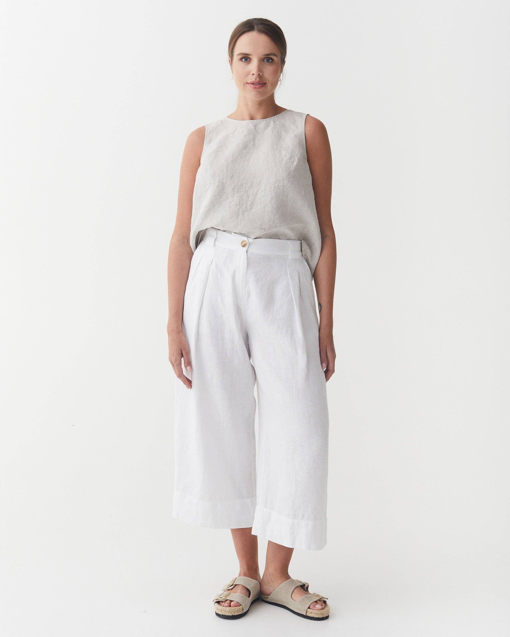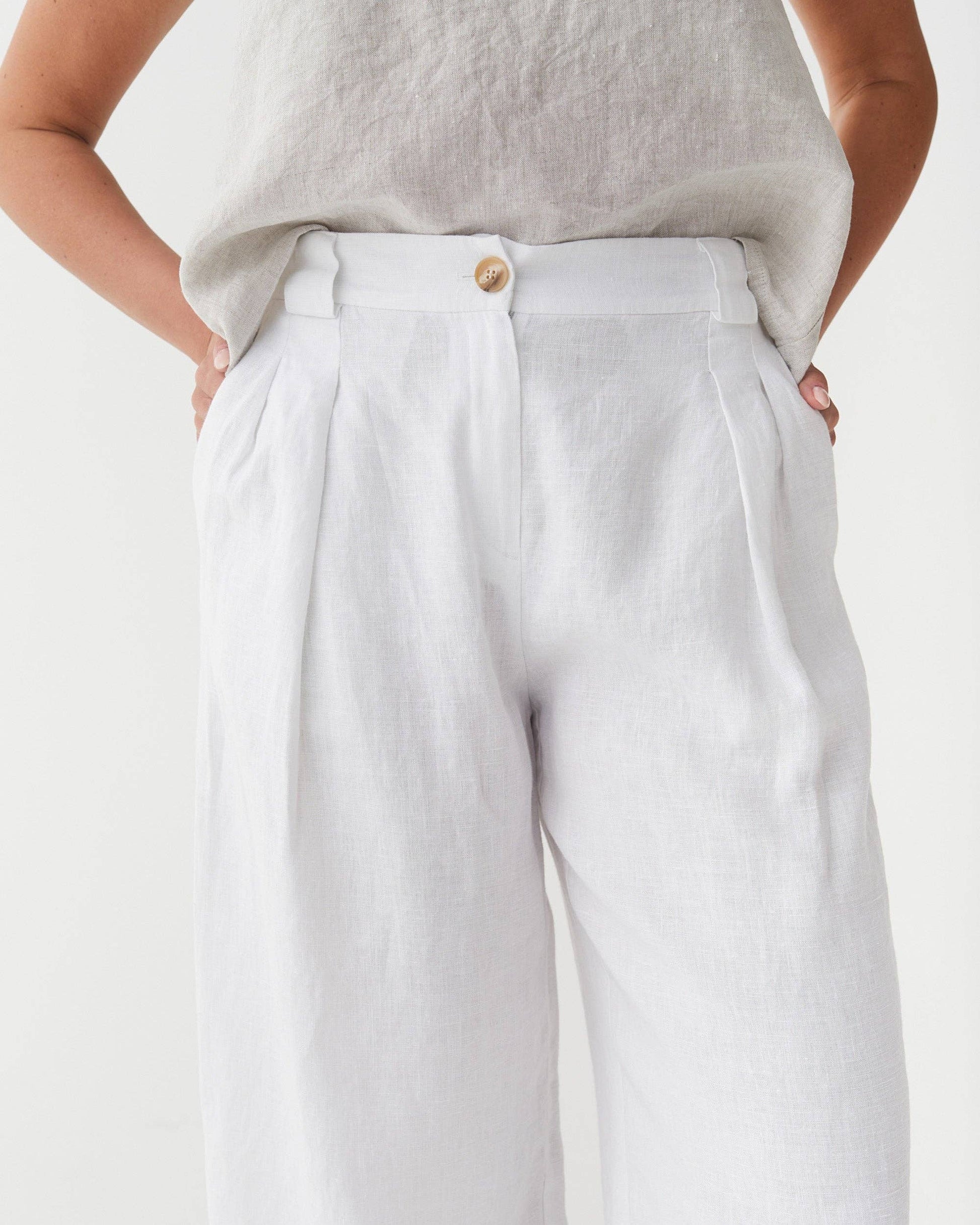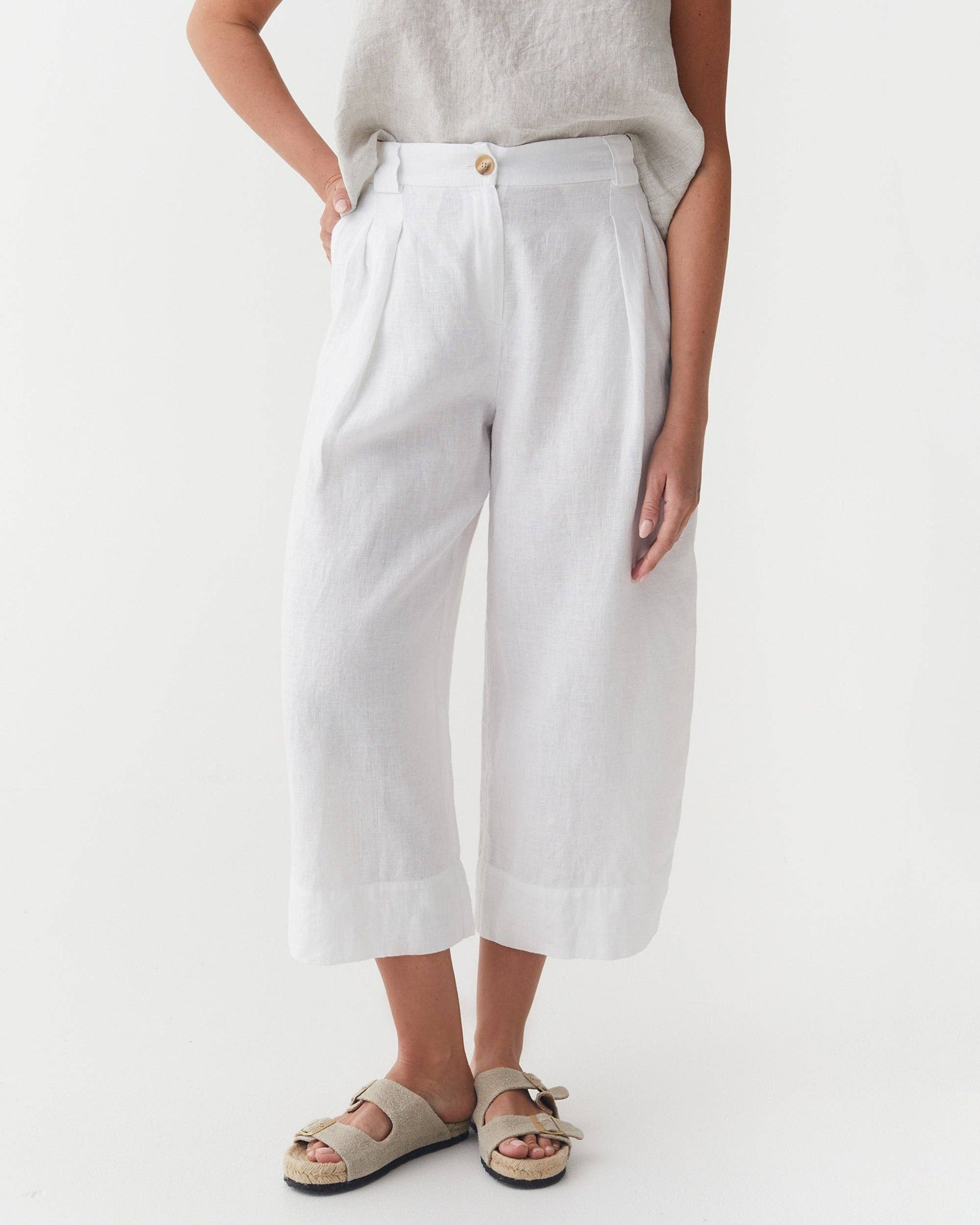 Upgrade your warm-weather wardrobe with the Cropped Linen Pants ISCHIA in White. Designed for comfort and effortless elegance, these pants feature a relaxed fit and a cropped length that pairs beautifully with sandals or sneakers. The breathable linen fabric keeps you cool on hot days, while the elasticated waistband at the back ensures a comfortable fit. Whether you're strolling through the city or relaxing at home, these versatile pants offer a timeless, laid-back look.