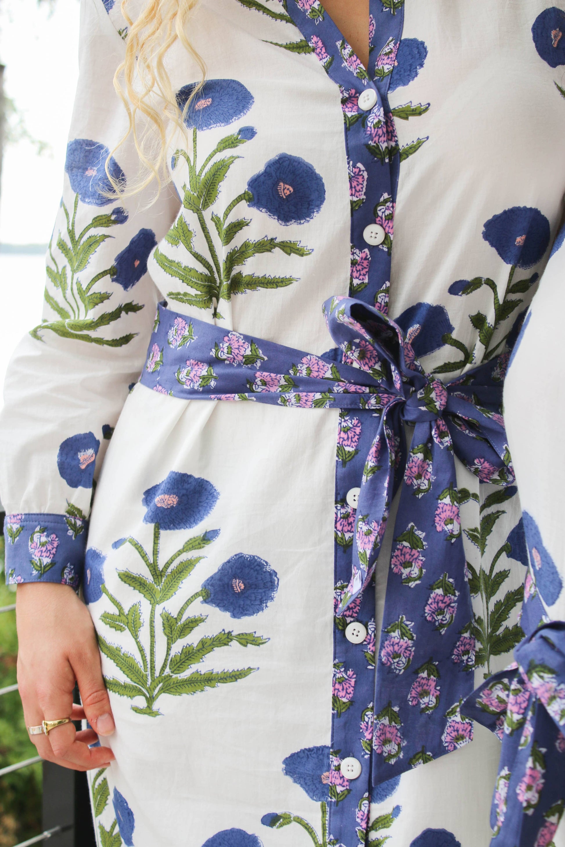 Say hello to our Daphne Dress! This dress features organic fabric that was printed by hand in India, and this dress was sewn in New York City. The dresses run true to size, if you are between sizes we recommend you size up one size. For this collection the matching belt is included! Please allow variations in the print and dyes of the fabric. This is a handmade item. Care: This dress is made out of 100% organic block printed cotton. This fabric was stamped and dyed by hand in India. It is machine washable, we recommend on cold and laying flat to dry. We recommend washing by itself for the first wash. Quick Measurements: