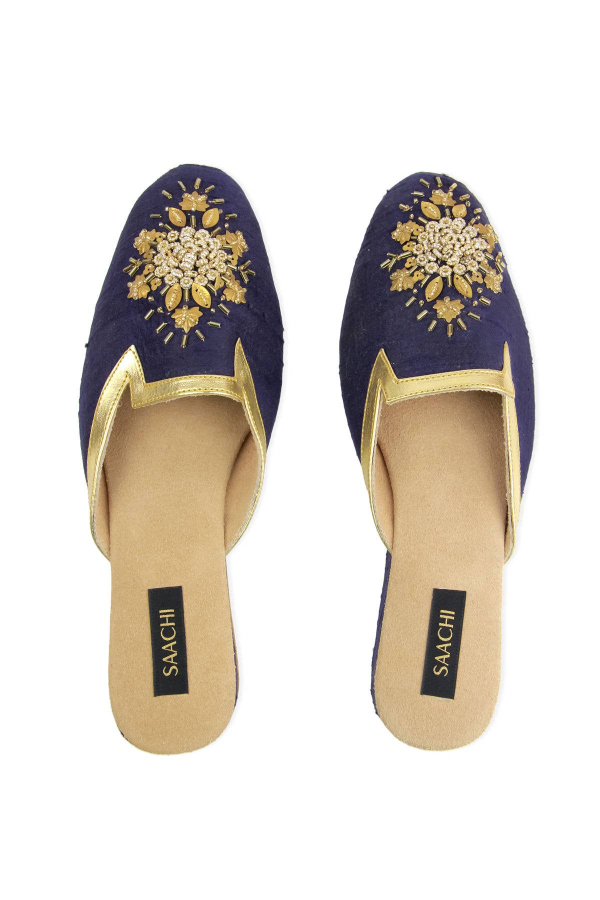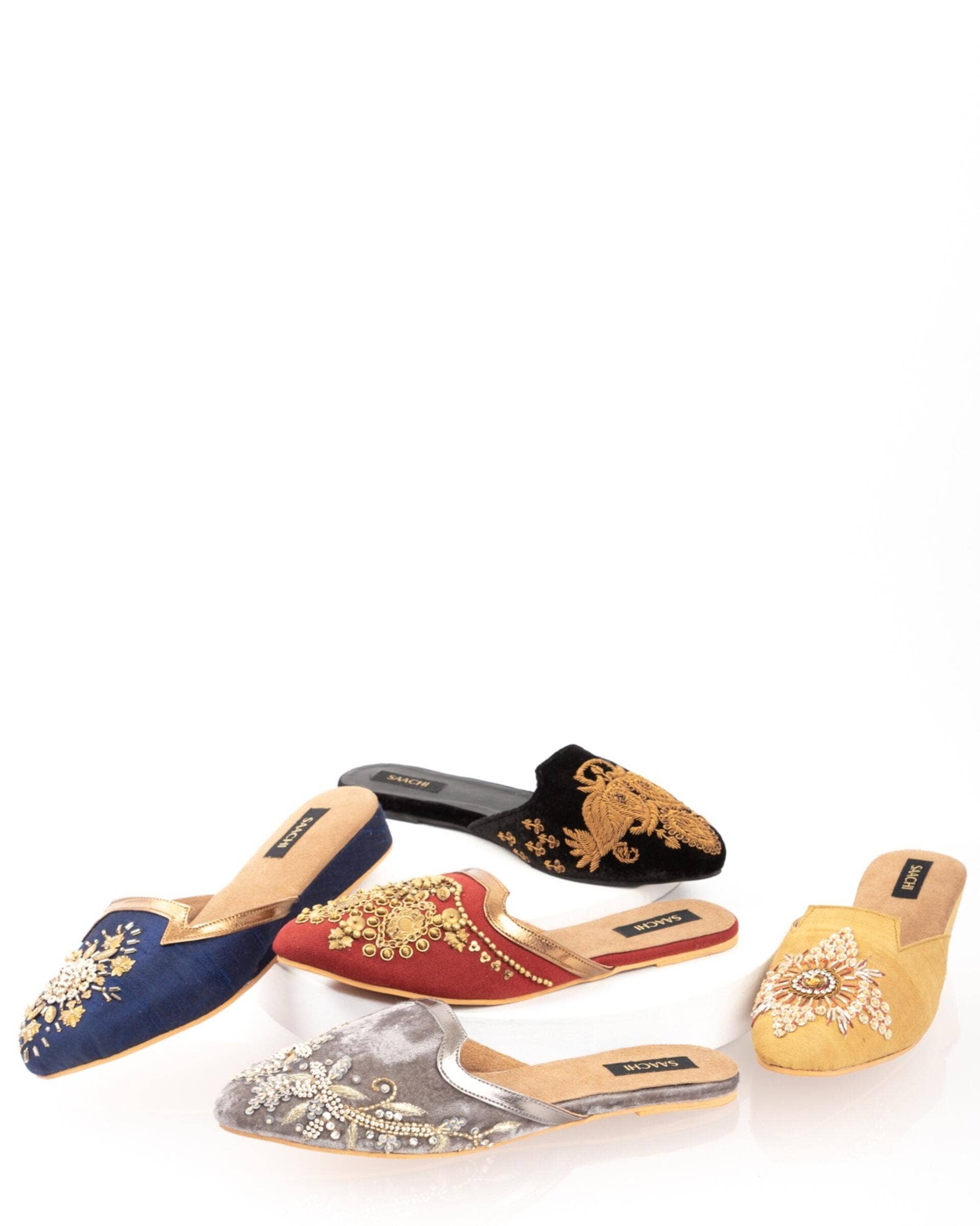 Our eye-catching Delilah Motif Mules have a 3D floral design with gold embellishments. Trimmed in gold leather, these gorgeous mules can be worn day or night for an instantly ornate touch to your outfit.