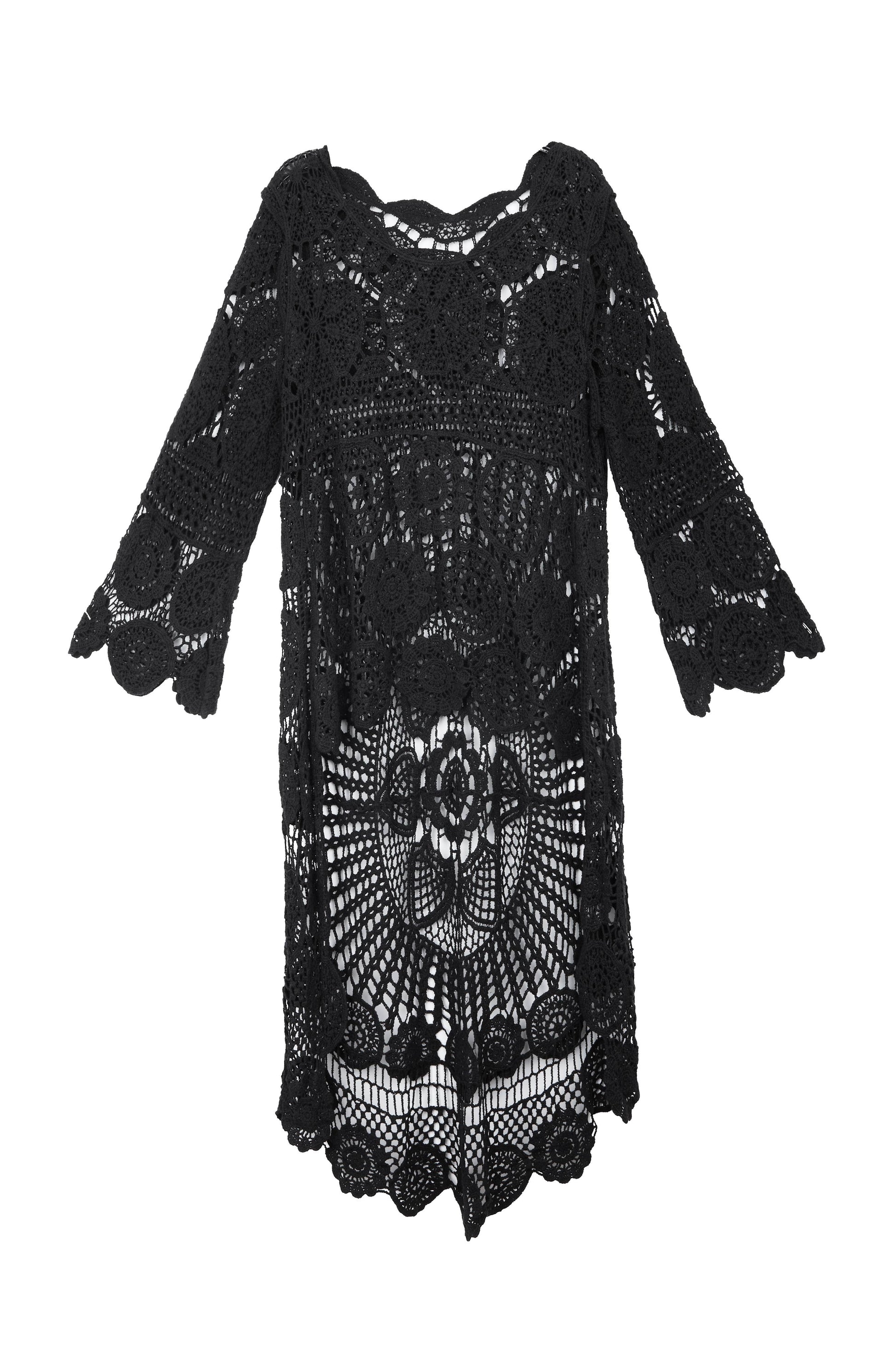 This bohemian dream features intricate floral and medallion patterns for a touch of textural detail. Made with lightweight, breathable material, it drapes beautifully with a subtle scalloped neckline and a flowy, high-low silhouette. It's a statement piece for any vacation, perfect for layering over your swimsuit or a tank and shorts.