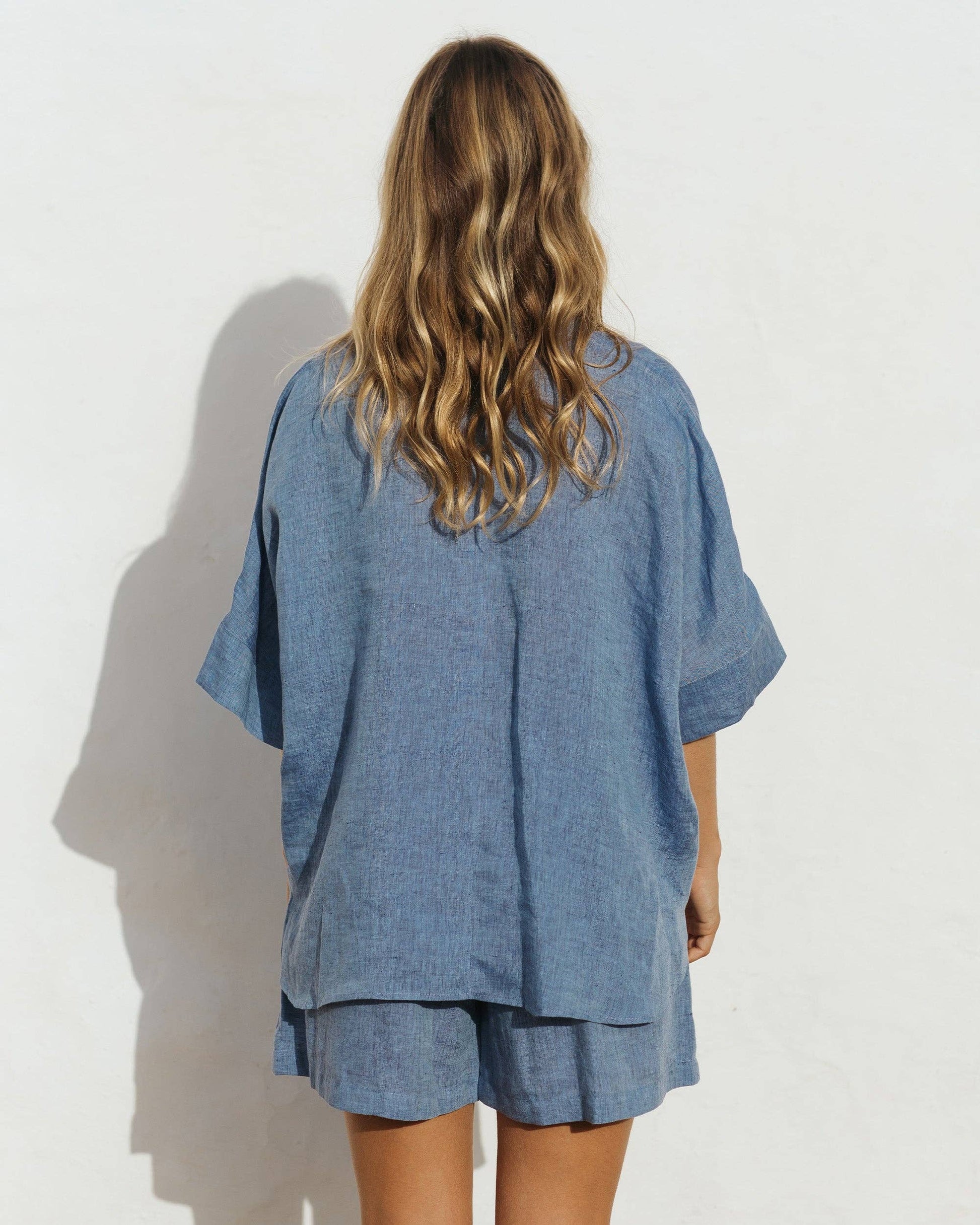 Follow the sun. High waist linen shorts CUENCA in Denim chambray is the epitome of comfort, so you can chase the sun all day long. Made of lightweight linen, loose fit, therefore they are light and breezy. You can play by pairing these shorts with various tops – tuck them in if you want to emphasize the waistline or leave them flowing for a more relaxed look.