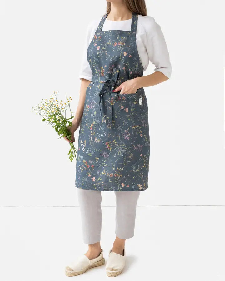Cook in style with our unisex wildflower print linen bib apron. The delightful herbarium-inspired botanical design adds a unique and whimsical touch to your kitchen attire, making it a must-have for any cooking enthusiast. Made from high-quality linen, this apron is naturally durable and can withstand the demands of everyday use. The twin-sectioned front pocket provides ample storage for your kitchen essentials, keeping your hands free to focus on your cooking. The adjustable neck and waist ties allow for a comfortable and secure fit, making it suitable for any body type. Whether you're cooking for your family or hosting a dinner party, this herbarium print linen bib apron is a practical and stylish addition to your kitchen attire.