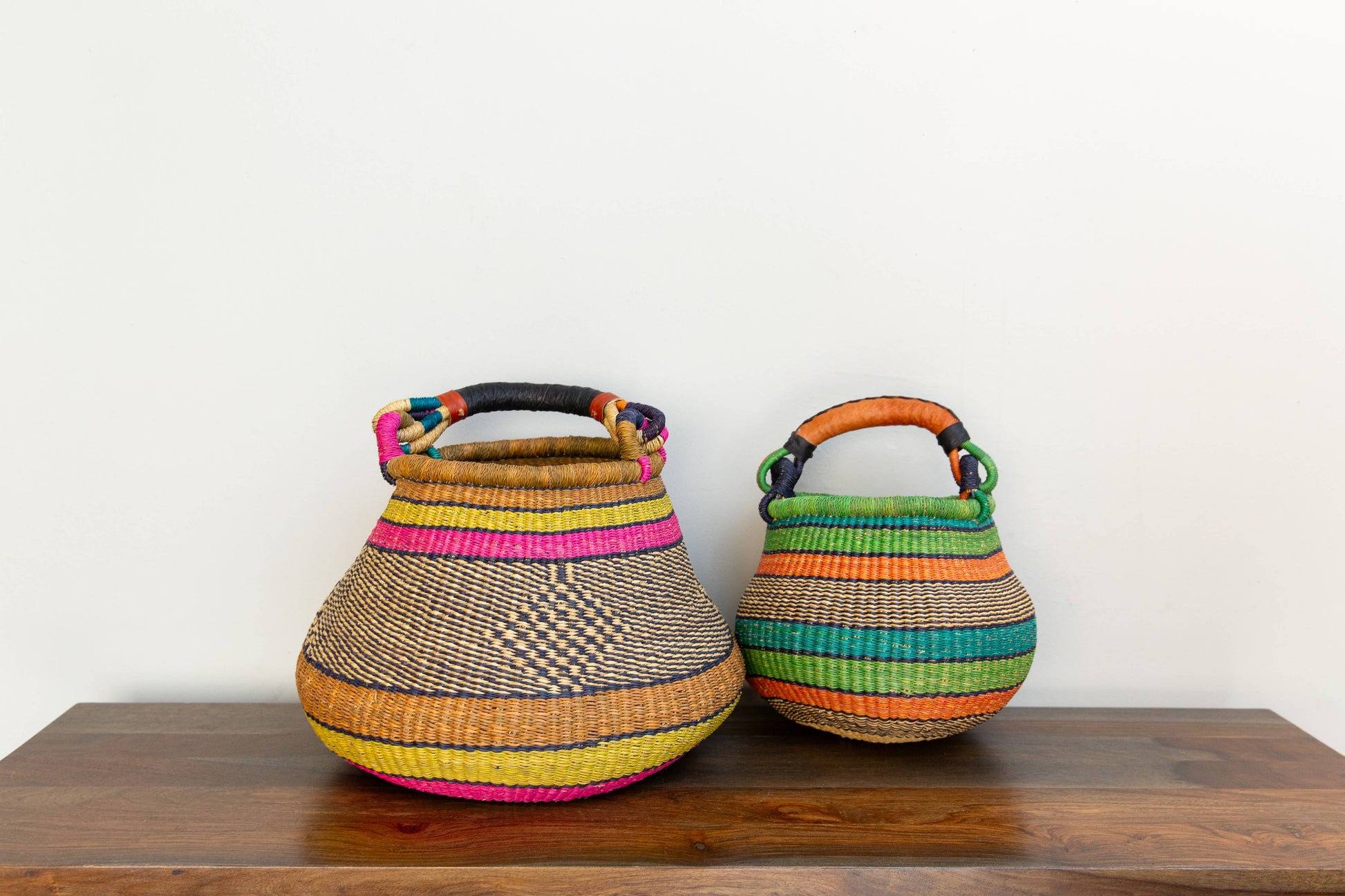 Our fair trade pot or Gambigo basket/ Bolga Basket is handwoven out of Kinkanhe straw from Bolga, Ghana and is more difficult to weave than our best-selling round market baskets. Leather swivel handle folds down flat. Comes assorted.