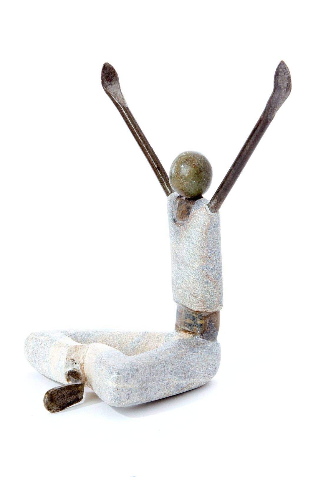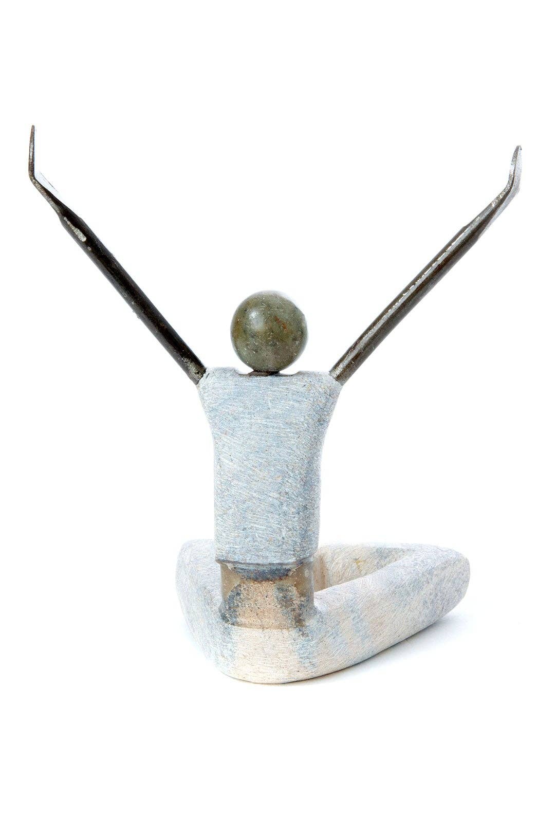 Zimbabwean artist Luke Jimu combines textured pale serpentine stone and recycled metal to portray scenes of every-day life. With legs crossed, and arms aloft and reaching to the sun, this stretching yogi sculpture celebrates the beauty of yoga.