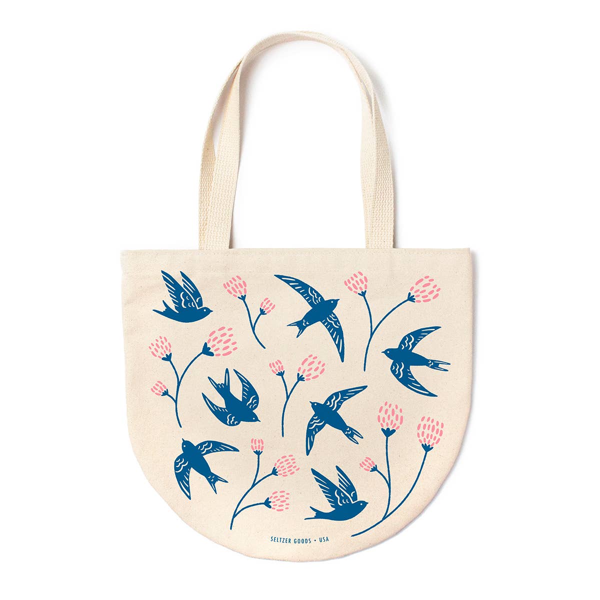 Fly through your day in style with this beautiful round-bottom bag decorated with swifts. A great gift for bird nerds! This tote measures approximately 14" W x 13" H and is made from extra heavy canvas.